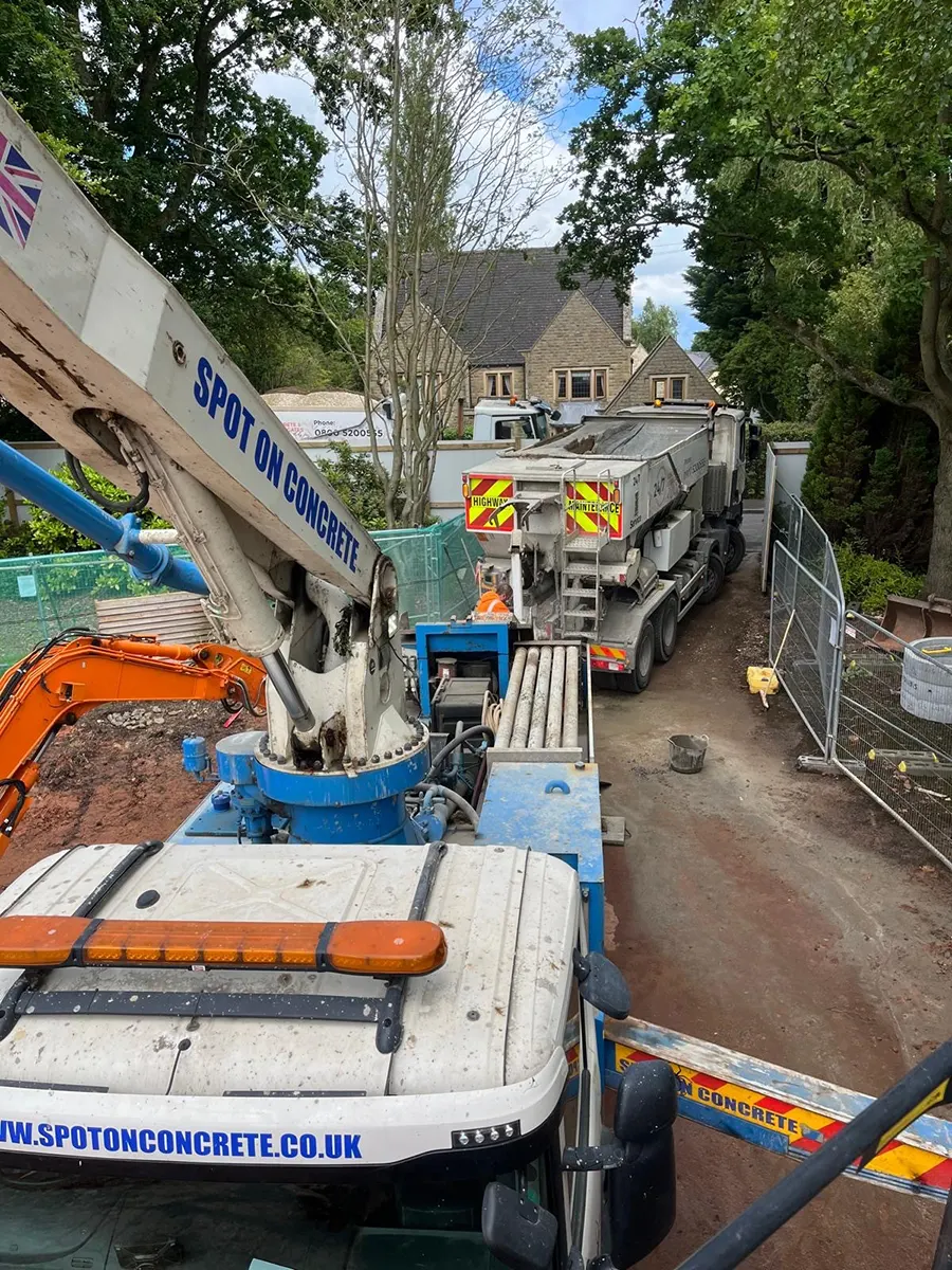 We provided an RC28/35 20mm aggregate mix, specifically designed for reinforced concrete. This mix has a higher cement content meaning it is a long-lasting foundation for new build homes such as this project. As this was a large pour with a slight access issue, we used our 34m boom pump to pour and place the concrete into the footing.